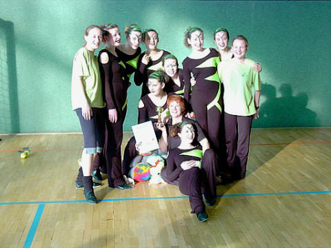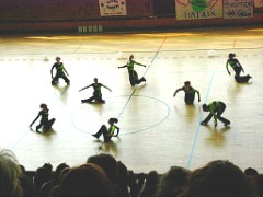 saßen oder standen ganz erstarrt und dann kam die Wertung: Flying Dancers 2,1,4,3,1 ;Flex Piont 1,5,2,1,3 ;Black Diamonds 4,2,1,2,2 . Was im ersten Moment für Platz 3 sprach, wurde beim zweiten Blick zur Sensation, auf Grund des Majoritätsprinzips, wurde das schier unglaubliche wahr: "Platz1". Ein Jubelschrei ging durch die Halle und plötzlich war alle Anspannung dahin, Freudentränen flossen, man lag sich in den Armen. Hier noch einige Bilder von der Siegerehrung. |